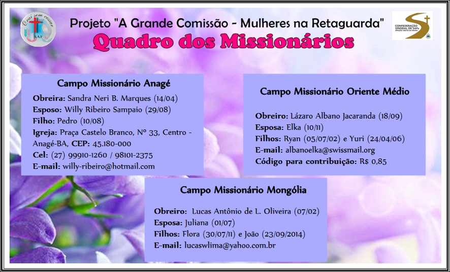 Na primeira reunião executiva da Confederação Nacional de SAFs, realizada em Curitiba/PR, em 31/05 a 03/06/2018, foi entregue pela Secretária de Evangelismo e Missões, a Sra. Alessandra Pereira da Silva Chagas, para a Sinodal Oeste da Bahia, três (03) cartões contendo nomes de Missionários da JMN e APMT para orar – Projeto a Grande Comissão – Mulheres na Retaguarda. Sendo eles: Campo de Anagé/BA; Mongólia e Oriente Médio.