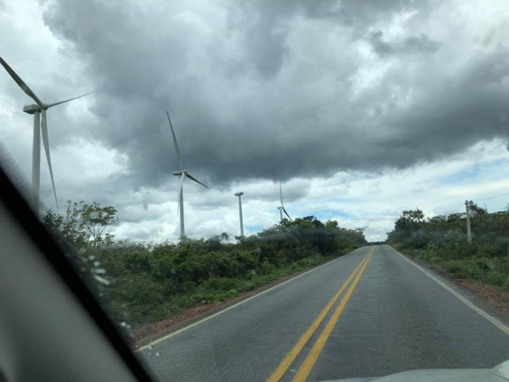 Saindo de Guanambi, avistamos essa linda paisagem com as torres aerogeradores de energia eólica – Complexo Eólico do Alto Sertão na região baiana de Guanambi e Caetité e que possuem uma capacidade conjunta de produção de 680,5 megawatts inaugurada em 2014.